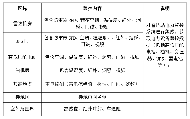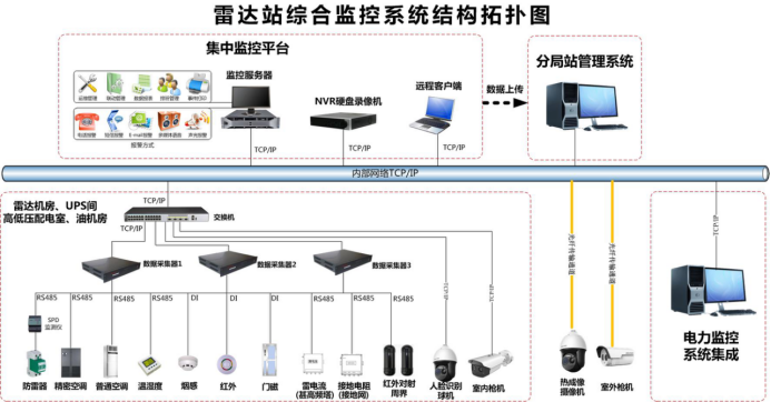 通過建設雷達站智能綜合監(jiān)控系統(tǒng)可以對分布在雷達站各個區(qū)域獨立的動力設備和環(huán)境設施、安防設施對象進行遙測、遙信等采集,實時監(jiān)視各基礎設施、安防設備的運行狀態(tài),記錄和處理相關數據,及時偵測故障,并作必要的遙調、遙控操作,適時通知管理人員處理,結合先進的視頻監(jiān)控系統(tǒng),對雷達站進行可視化監(jiān)測,實現雷達站的少人、無人值守,以及電源、空調的集中監(jiān)控維護管理,提高供電系統(tǒng)的可靠性和通信設備的安全性,為雷達站的管理自動化、運行智能化和決策科學化提供有力的技術支持。