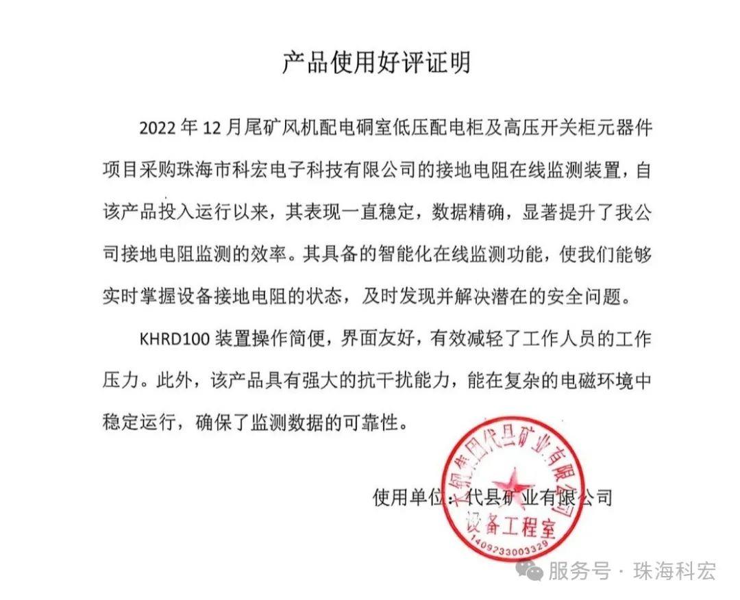 近日,太鋼集團(tuán)代縣礦業(yè)對(duì)我司的接地電阻在線監(jiān)測(cè)裝置給予了高度評(píng)價(jià),這一反饋無疑是對(duì)我們產(chǎn)品性能和服務(wù)質(zhì)量的有力肯定。